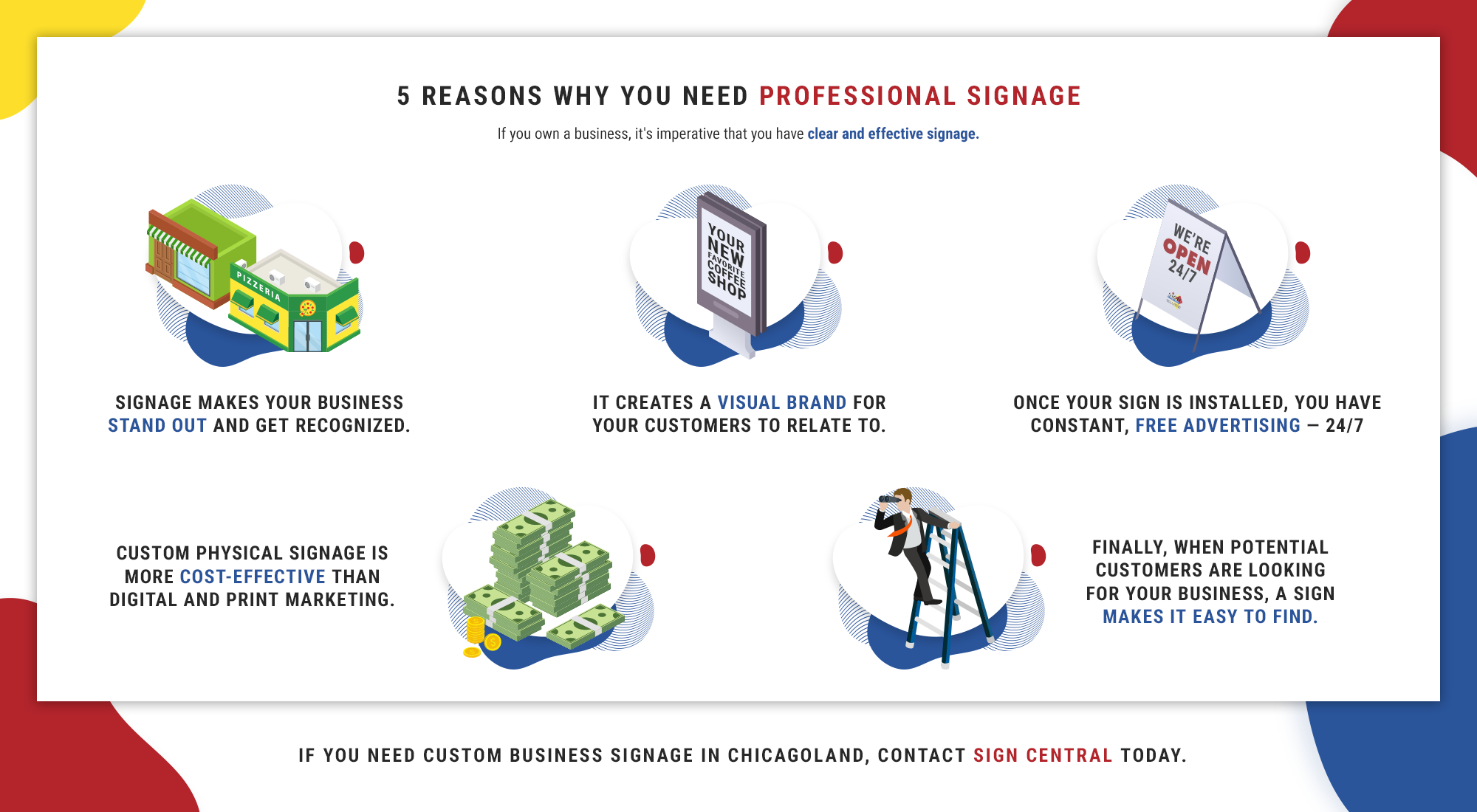 There are so many reasons your business should have an eye-catching sign. As Aurora’s trusted sign company, our team at Sign Central is dedicated to providing businesses in the Chicagoland Area and surrounding suburbs with custom-made signs that we design, fabricate, and install, to drive traffic to your business. Here are six reasons why signage is a crucial element for your business. Be sure to watch our video, too!