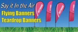 Sign Central’s Flying Banners are the most eye catching way to get noticed. Feather banners and teardrop banners make the greatest impact on clients and any audience. Full color flying banners make it easy to design any layout. Feather banner and teardrop banners are all full color so the sky is the limit when it comes to your design. You cannot go wrong with feather banner and teardrop banners, SAY IT IN THE AIR! Teardrops: 6.75′ Tall, 8.6′ Tall, 12.6″ tall and 14.5′ Tall Feather Banners: 8′ Tall, 12′ tall, 14.5″ tall and 18′ tall. You can order these amazing flying banner signs online at our online sign store.